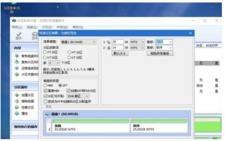 6、設置分區數目、分區大小還有分區類型,卷標為【系統】的系統盤建議60G以上,由于選擇了UEFI啟動,磁盤類型需要選擇GPT,【分區對齊到】是4k對齊,2048扇區就行,也可以4096扇區,確認無誤之后點擊開始執行按鈕。