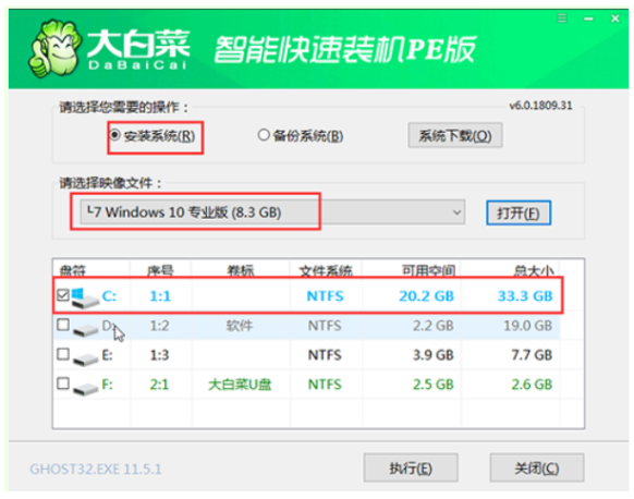 5、點擊打開大白菜一鍵裝機軟件,選擇“安裝系統”,“映像文件”選擇已下載的win10鏡像系統,安裝在“C盤”,鼠標點擊“執行”進入下一步。