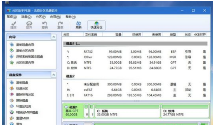 7、分區過程比較快,分區完成后,如下圖所示,GPT分區會有兩個沒有盤符的ESP和MSR,這兩個分區注意不要去動,只需要看你分出的C、D盤等,如果盤符被占用,選擇已經占用C盤的那個盤,左側選擇【更改盤符】,以此類推即可。