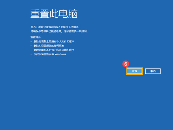 7. 點擊[重置],計算機將會開始重新安裝Windows。