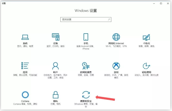 1、使用Win+I快捷鍵打開電腦設置,選擇【更新和安全】進入。