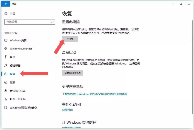 2、在左側菜單中選擇【恢復】-【重置此電腦】-【開始】。