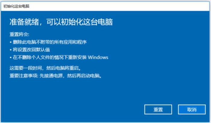 4、根據提示操作,最后選擇【重置】,等待系統自動配置即可。