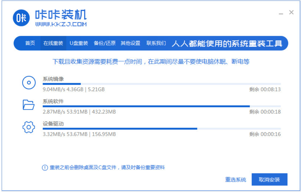 4、大家等待咔咔裝機工具自動安裝系統,然后安裝完成后重啟電腦。