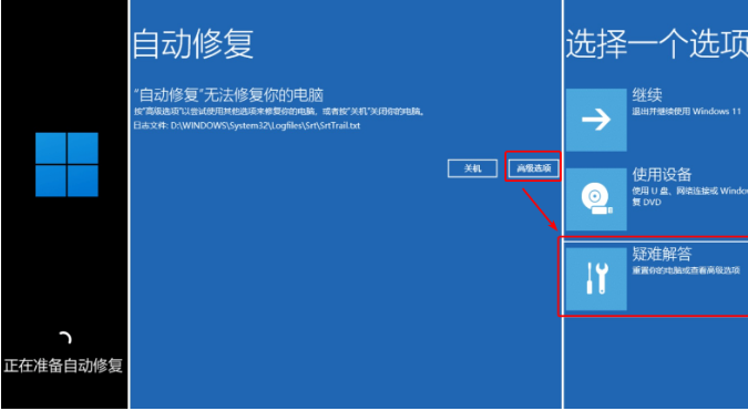 等待進入修復界面 - 查看高級選項 - 疑難解答。