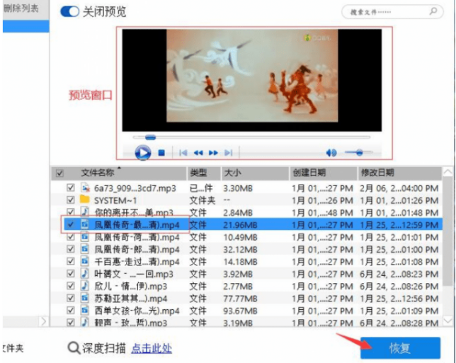 3、在右下角的預覽列表中,選擇自己需要恢復的文件后,點擊藍色按鈕“恢復”。