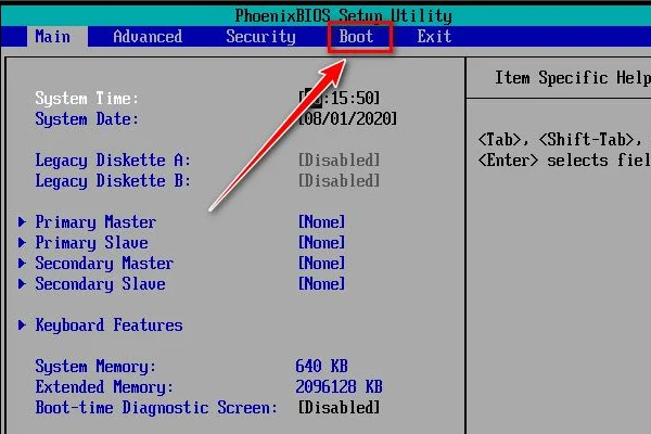 2、按鍵盤上的“左”“右”方向鍵選擇菜單欄上的“Boot”項。