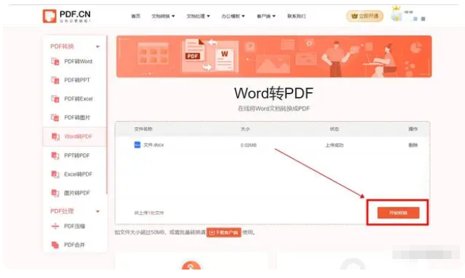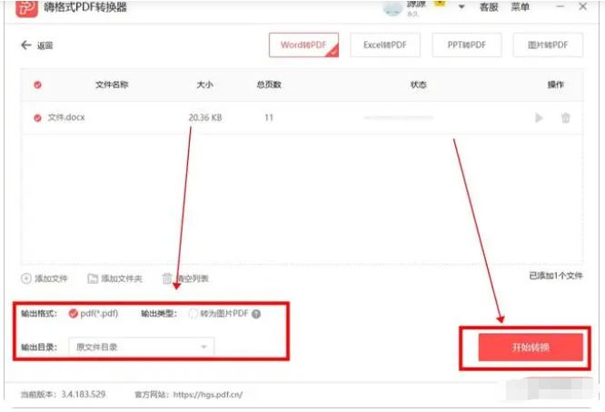 3、Word文件添加完成后,點擊右下角的“開始轉換”按鈕,這樣等待添加的Word文件轉換成PDF文件就可。