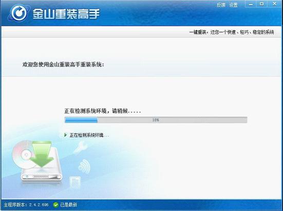 3、安裝完打開金山重裝高手,革命性一鍵裝機工具,該工具無需系統光盤,無需重復打補丁,一鍵重裝系統,并且自動備份/還原數據,永不丟失。