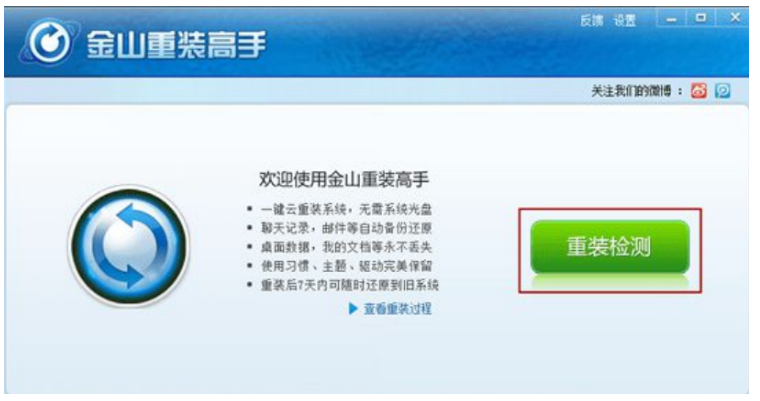 1、首先下載安裝并打開"金山重裝高手",點擊"重裝檢測"。