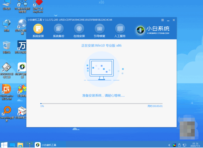 在pe系統內,小白裝機工具會自動安裝系統,完成后會自動重啟計算機。