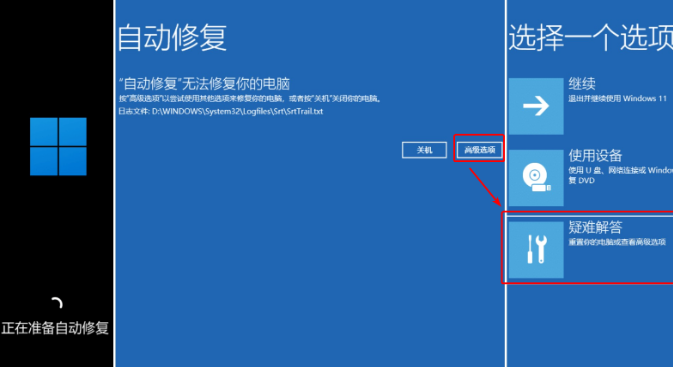 等待進入修復界面 - 查看高級選項 - 疑難解答。