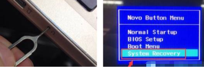 將聯想小新V4000-ISE電腦強制關機,找一根卡針,插入筆記本的一鍵恢復小孔(不同筆記本恢復孔的位置不一樣),進入Novo Button Menu,按下方向鍵選擇,并回車System Recovery選項。