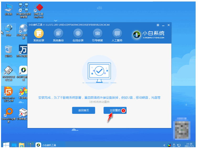 3、系統安裝完畢后再次點擊重啟電腦;