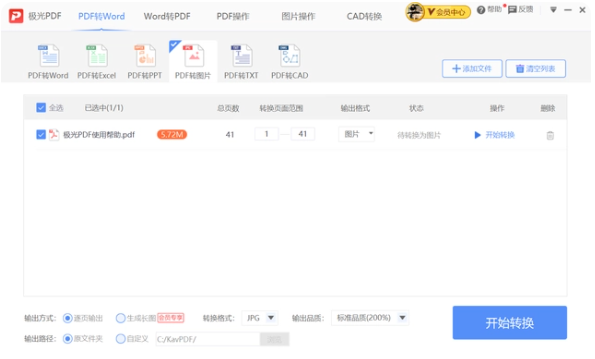 1.打開極光PDF轉換器頁面后,接著把需要轉換的PDF文檔,拖拽到轉換器中間空白區域,把PDF文檔添加進來;根據需要設置【輸出格式】、【轉換格式】、【輸出路徑】后,鼠標點擊【開始轉換】;