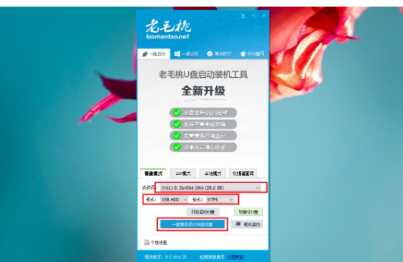 1、插入一個8g以上的空u盤到電腦接口,下載并打開老毛桃u盤啟動盤制作工具,默認設置,點擊“一鍵制作成USB啟動盤”。