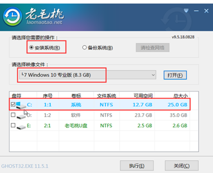4、然后,打開老毛桃一鍵裝機軟件,選擇系統鏡像安裝到系統盤c盤,點擊執行。