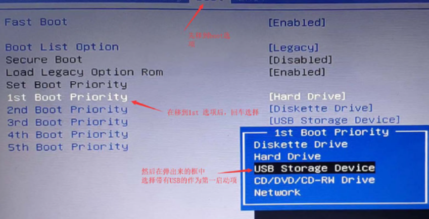2、通過bios快捷鍵進入boot頁面,設置u盤為第一啟動,然后重啟。