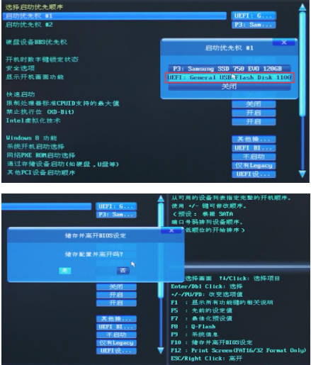2. 在鍵盤上按下bios啟動快捷鍵,進入bios界面,選擇啟動優先權 #1選項,按回車鍵選擇帶USB字樣的選項,按F10保存后重啟電腦。