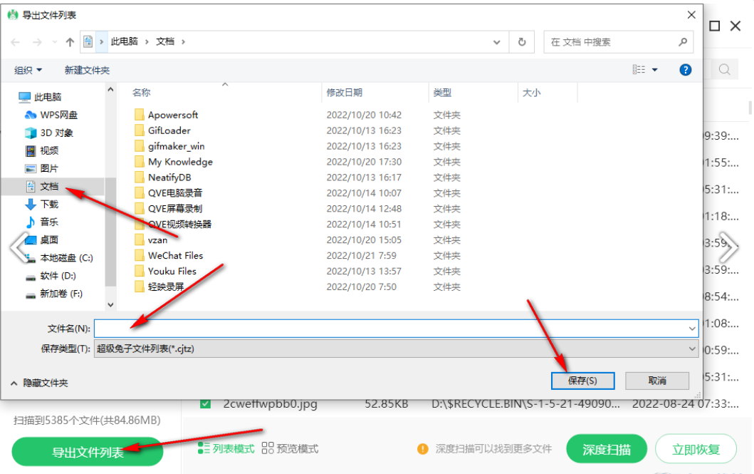 7、在左下角有一個【導出文件列表】按鈕,你可以點擊一下,將自己掃描勾選出來的文件導出在指定的文件夾中保存。