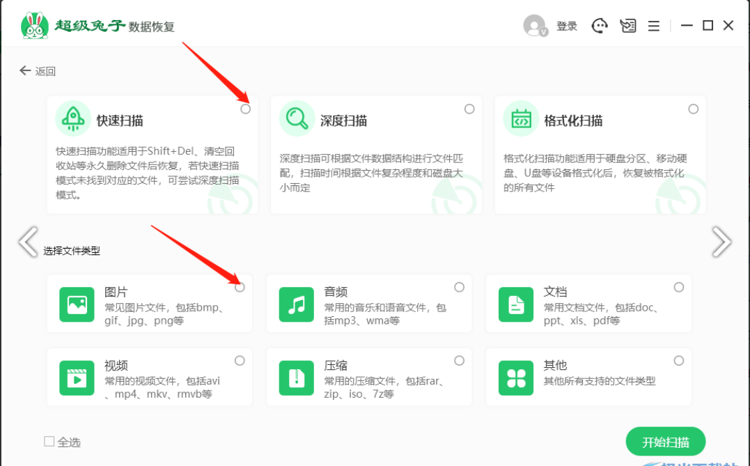 3、通過【快速掃描】【深度掃描】以及【格式化掃描】來選擇,如果我們選擇【快速掃描】則在下方需要選擇文件類型,根據自己想要恢復的文件來選擇,這里勾選【圖片】,然后點擊【開始掃描】。
