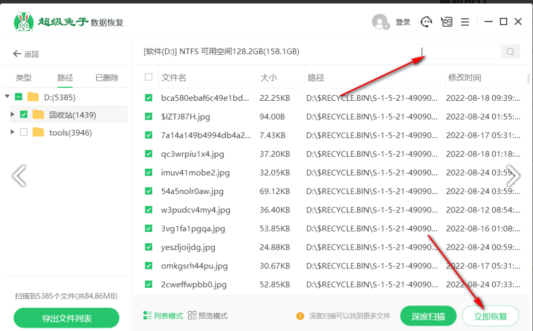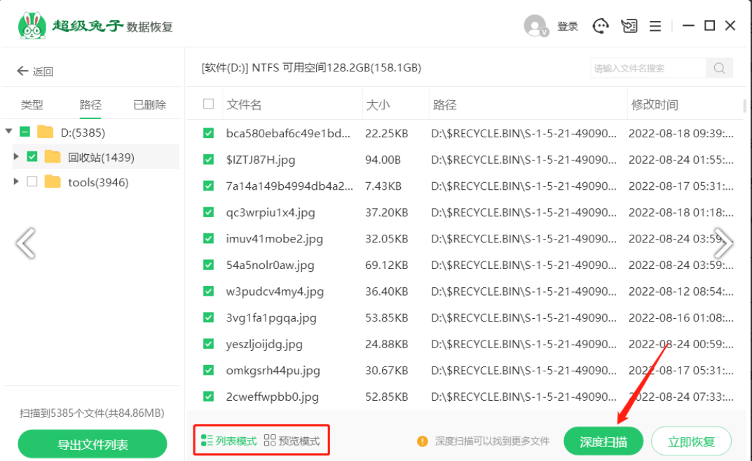 8、在頁面的底部可以選擇將該頁面進行【列表模式】或者【預覽模式】來顯示,如果該頁面沒有掃描出自己需要恢復的文件,那么點擊【深度掃描】按鈕即可進入頁面再次掃描。