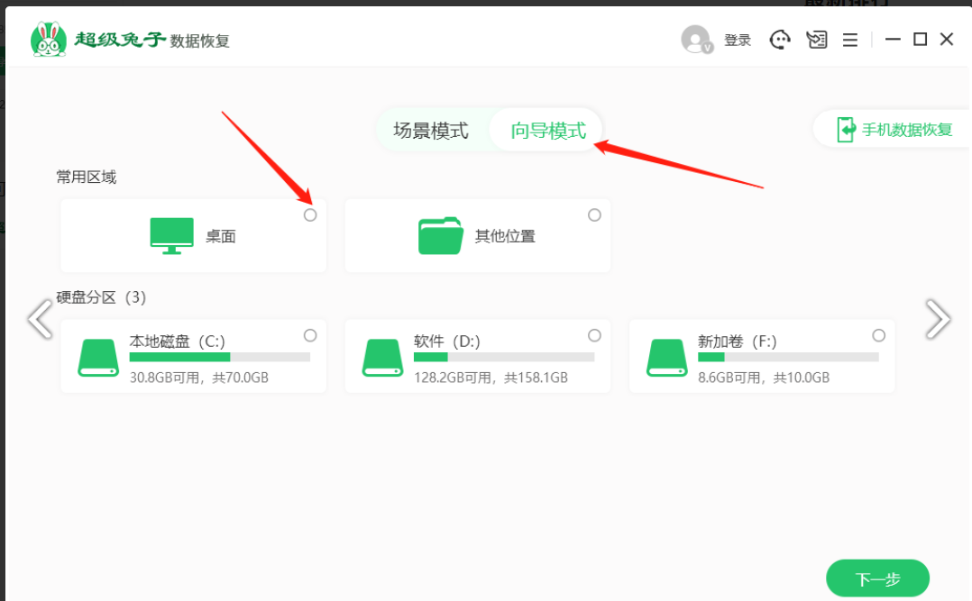 2、進入到【向導模式】中選擇自己需要恢復的區域或者分區,這里選擇【桌面】,然后點擊下一步。