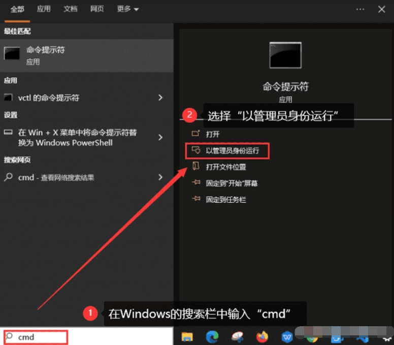 1、在Windows的搜索框里輸入【cmd】,在打開的窗口里面點擊【以管理員身份運行】。