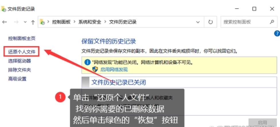 3、在打開的窗口,點擊【還原個人文件】,然后找到你要恢復的數據,點擊【恢復】還原。