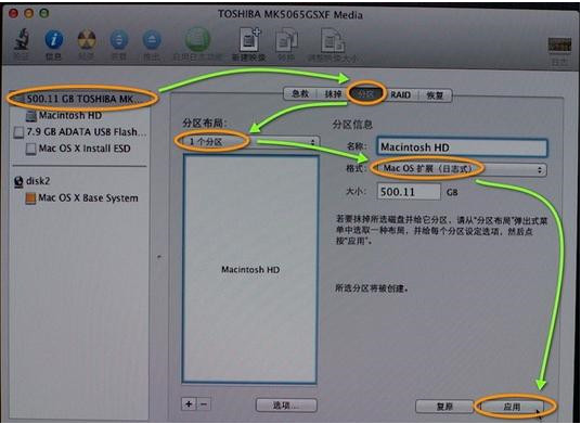 5、然后選擇要安裝系統的硬盤,點擊【分區】,分區布局選擇【1個分區】,格式選擇【Mac OS擴展(日志式)】,最后點擊應用。