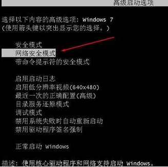 2.接著再開機按F8鍵(這時鍵盤肯定能用),再到高級啟動選項下選擇”帶網絡的安全模式“。