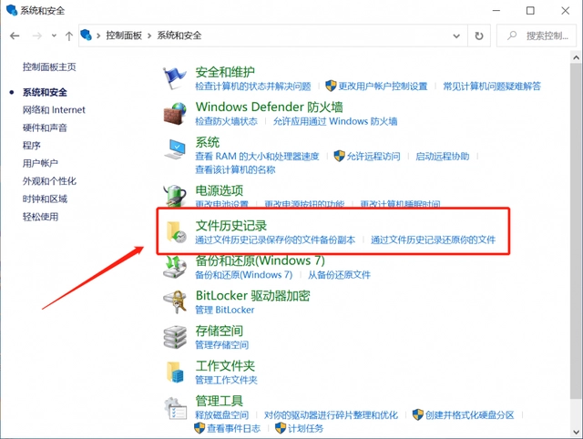2、進入電腦控制面板界面,找到并點擊“系統和安全-文件歷史記錄”。