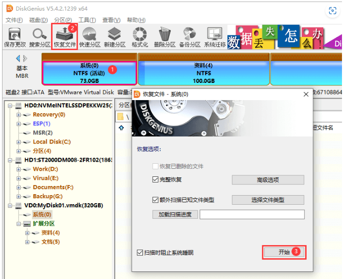 3、找到虛擬磁盤上需要恢復數據的分區,選中該分區,然后點擊“恢復文件”。在彈出的恢復文件對話框上點擊“開始”按鈕。