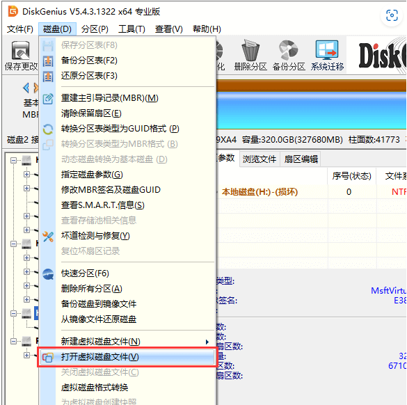 1、在需要恢復數據的虛擬機中下載并安裝DiskGenius并啟動,菜單選擇:磁盤 > 打開虛擬磁盤文件。