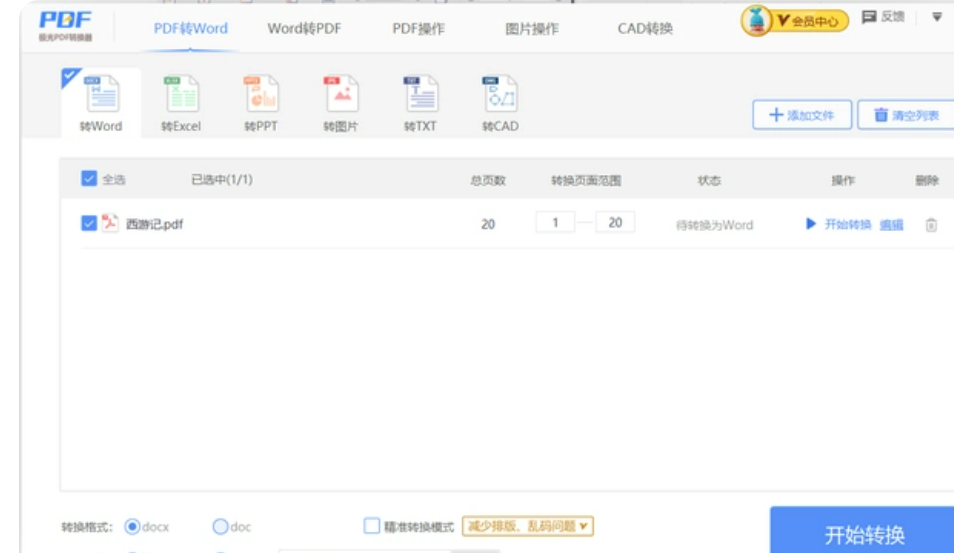 從上述入口進入極光PDF轉換器后會自動定位到“PDF轉Word”,根據需要設置好轉換范圍、輸出格式、輸出路徑后,就可以點擊開始轉換,稍加等待后我們的PDF文件就成功轉換成Word文檔了。值得一提的是,轉換選項中還提供了精準轉換模式,即便PDF中是圖片,也能將圖片上的文字提取出來,并且盡可能的保留原來的排版。