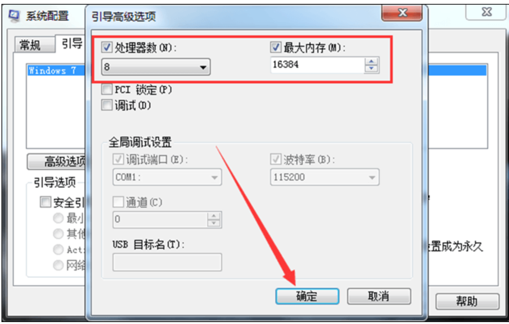 3、接著在“引導高級選項”界面中,將“處理器數”和“最大內存”調整到最大,然后點擊“確定”就可以了。