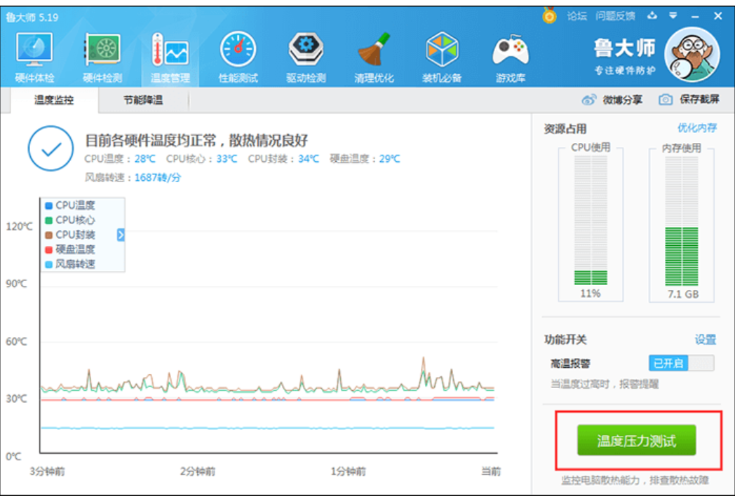 1、我們可以打開魯大師,然后點擊“溫度管理”,在“溫度監控” 界面中點擊“溫度壓力測試”排查電腦散熱情況,檢查散熱故障。