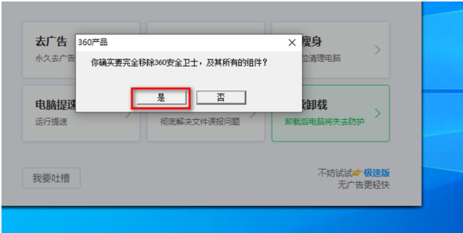 8、在彈出是否移除360安全衛士對話框時,點擊【是】。