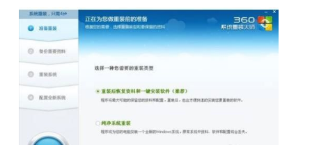 3、電腦檢測環境后,有兩種重裝類型。一是重裝后恢復資料和一鍵安裝軟件,二是純凈系統??梢赃x擇純凈系統時記得將重要的東西進行備份。