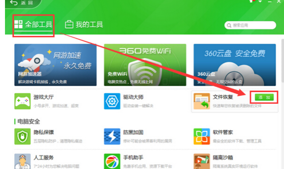 2.全部工具里我們找到360數據恢復大師(文件恢復),雙擊添加。