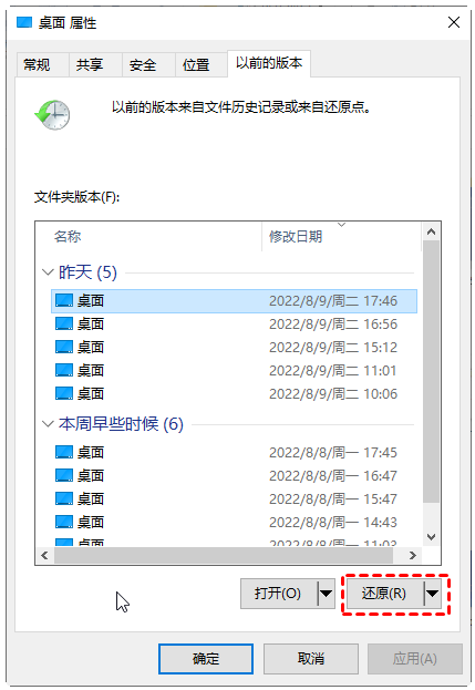 3、或者可以右鍵單擊包含已刪除文件的文件夾,點擊“屬性”,然后選擇“還原以前的版本”。根據時間你可以通過單擊“還原”將文件夾恢復到以前的日期。