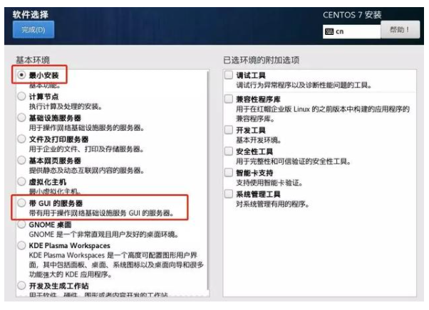 4、選擇最小化安裝,可以選擇帶GUI的服務器。
