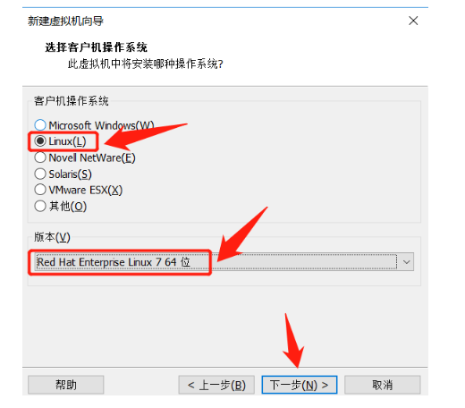4.客戶機操作系統選擇Linux(L)Red Hat Enterprise Linux 7 64 位,點擊下一步。