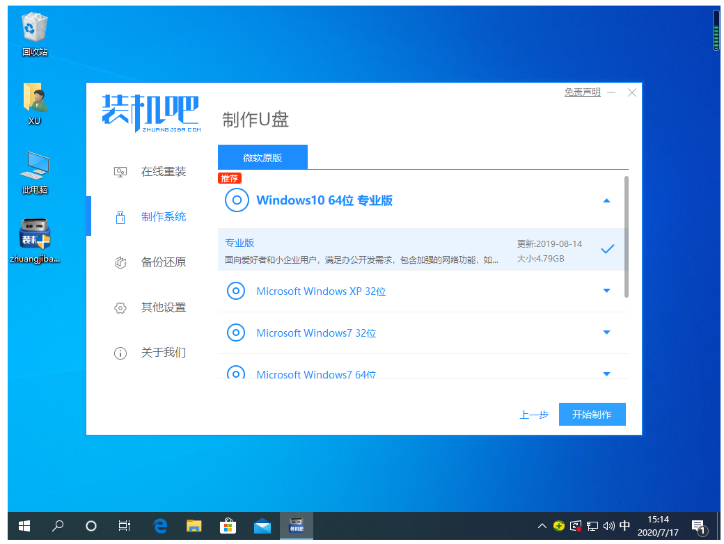 1、首先在一臺可正常使用的電腦中下載并安裝裝機吧一鍵重裝系統軟件。插入一個空白 U 盤,打開軟件,選擇制作系統,點擊開始制作。