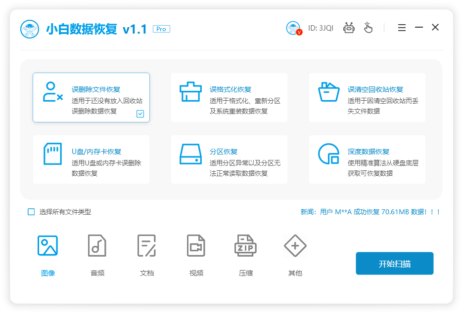 2、選擇誤刪除文件恢復,點擊開始掃描。