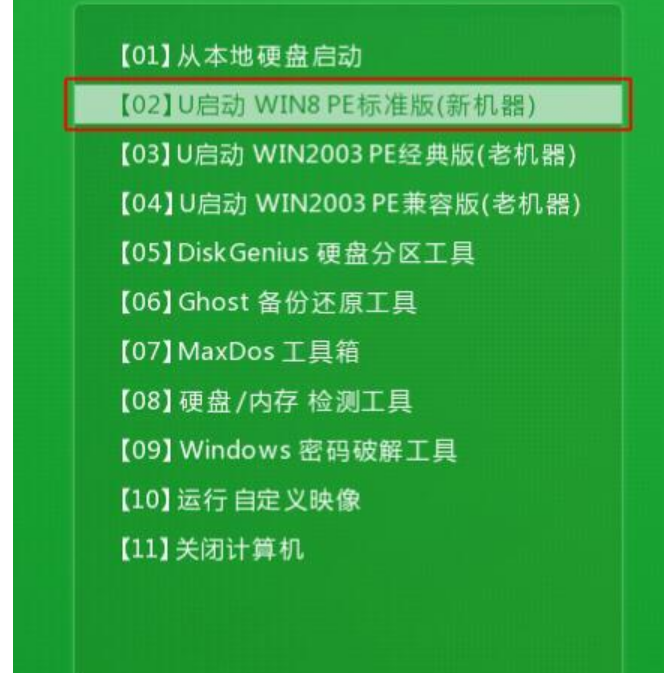 1、準備工作完成后,將u啟動u盤啟動盤連接電腦,開機或重啟電腦后,系統會自動進入u啟動主菜單界面。我們選擇“【02】u啟動win8pe”并回車。