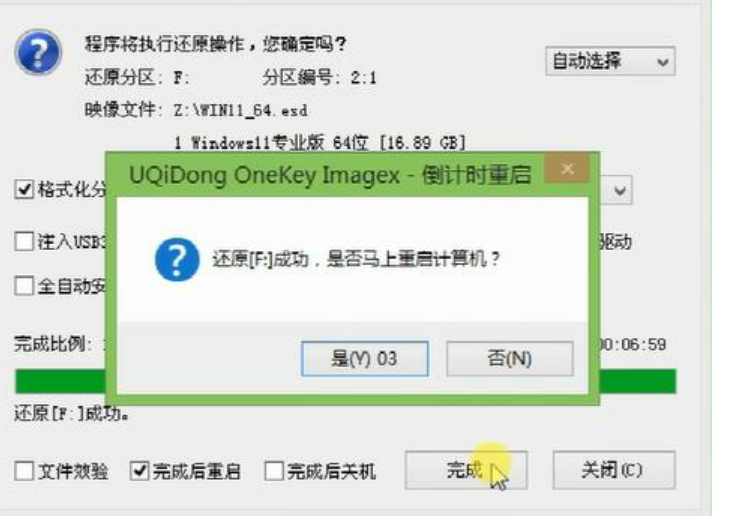 3、彈出程序將執行還原操作窗口,勾選“完成后重啟”復選框,點擊確定即可;