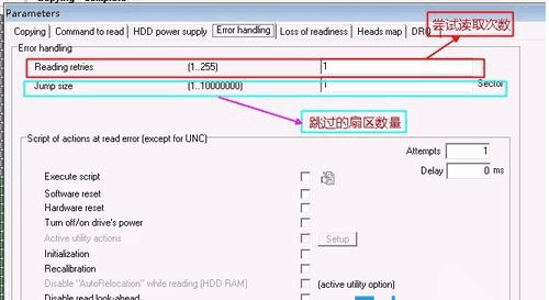 上圖是克隆參數設置界面,下圖是設置界面的錯誤處理參數設置。也就是說遇到克隆錯誤的時候的處理方式,可以設置嘗試讀取的次數和跳過扇區的數量。