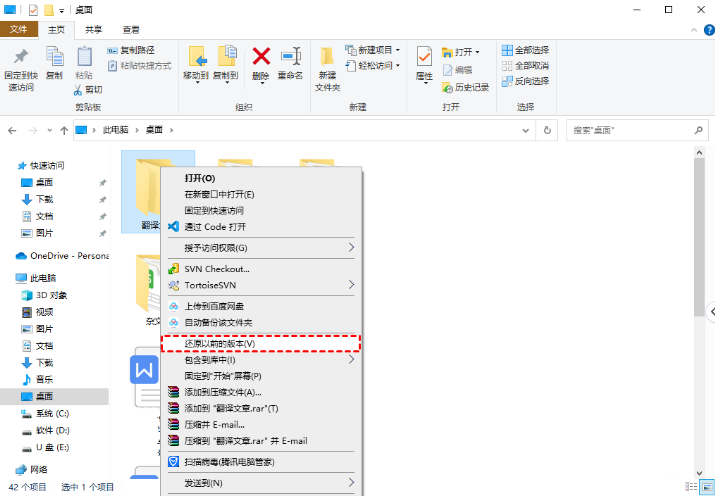 1、同時按Win+E以啟動Windows資源管理器,然后找到已刪除的文件或文件夾,右鍵單擊它并選擇“還原以前的版本”。