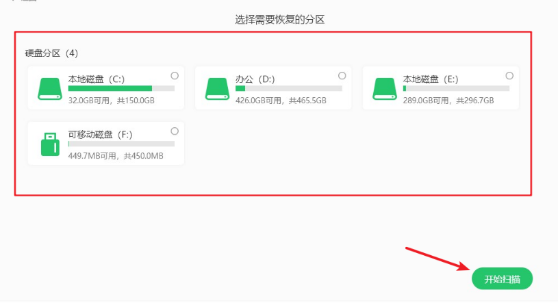 2. 選擇需要恢復數據的分區位置,確定好之后再點擊右下方的“開始掃描”按鈕。